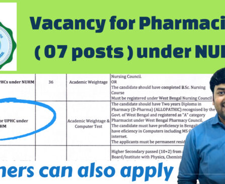 Post : Pharmacists for UPHC under NUHM National Urban Health Mission No. of vacancy : 7 Mode of Selection : Academic Weightage & Computer Test Essential Qualification : The candidate should have Two years Diploma in Pharmacy (D-Pharma) (ALLOPATHIC) recognised by the Govt, of West Bengal and registered as “A” category Pharmacist under West Bengal Pharmacy Council. The candidate […]