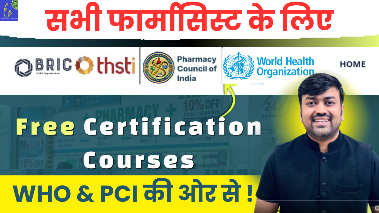 To encourage safe and effective medication practices, both the World Health Organization (WHO) and the Pharmacy Council of India (PCI) offer FREE certified courses for pharmacists. These certifications help improve dispensing quality, medication counseling, and patient safety — making them extremely valuable for D.Pharm, B.Pharm students, and working pharmacists.